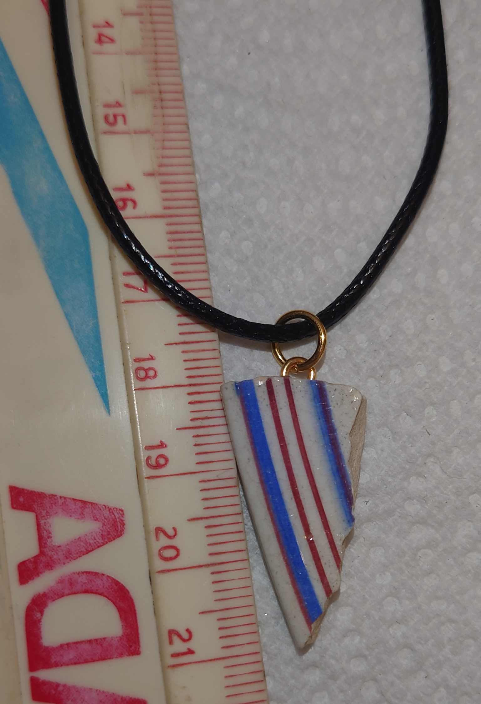 A red and blue stripy ceramic fragment on a black cord.