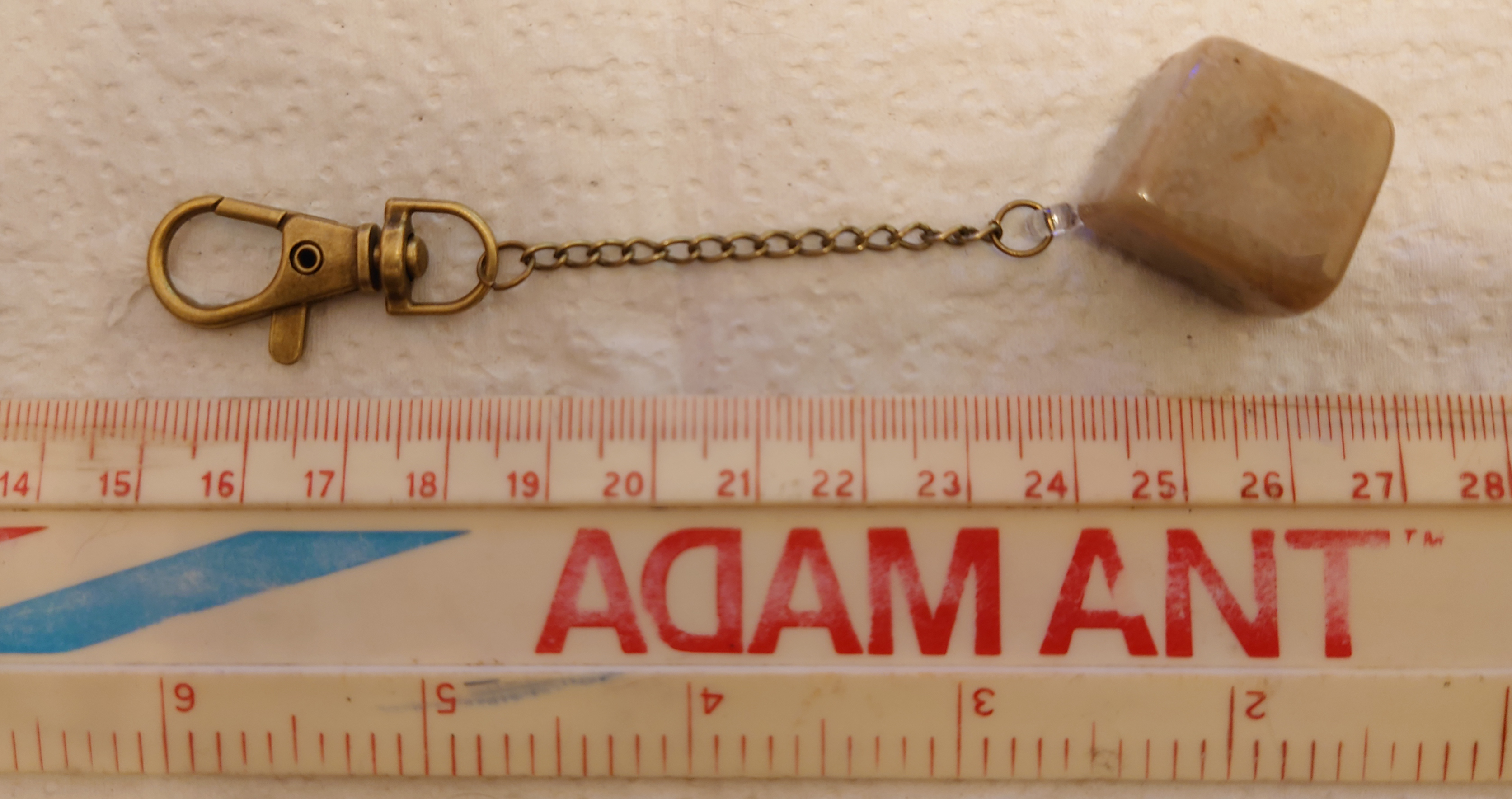 The name "coprolite" derives from Ancient Greek κόπρος (kópros), meaning "dung", and λίθος (líthos), meaning "stone". Yes, they are indeed fossilised poop. This particular piece of shit has been tumbled into a vague cube, enabling you to carry it round on a key ring.