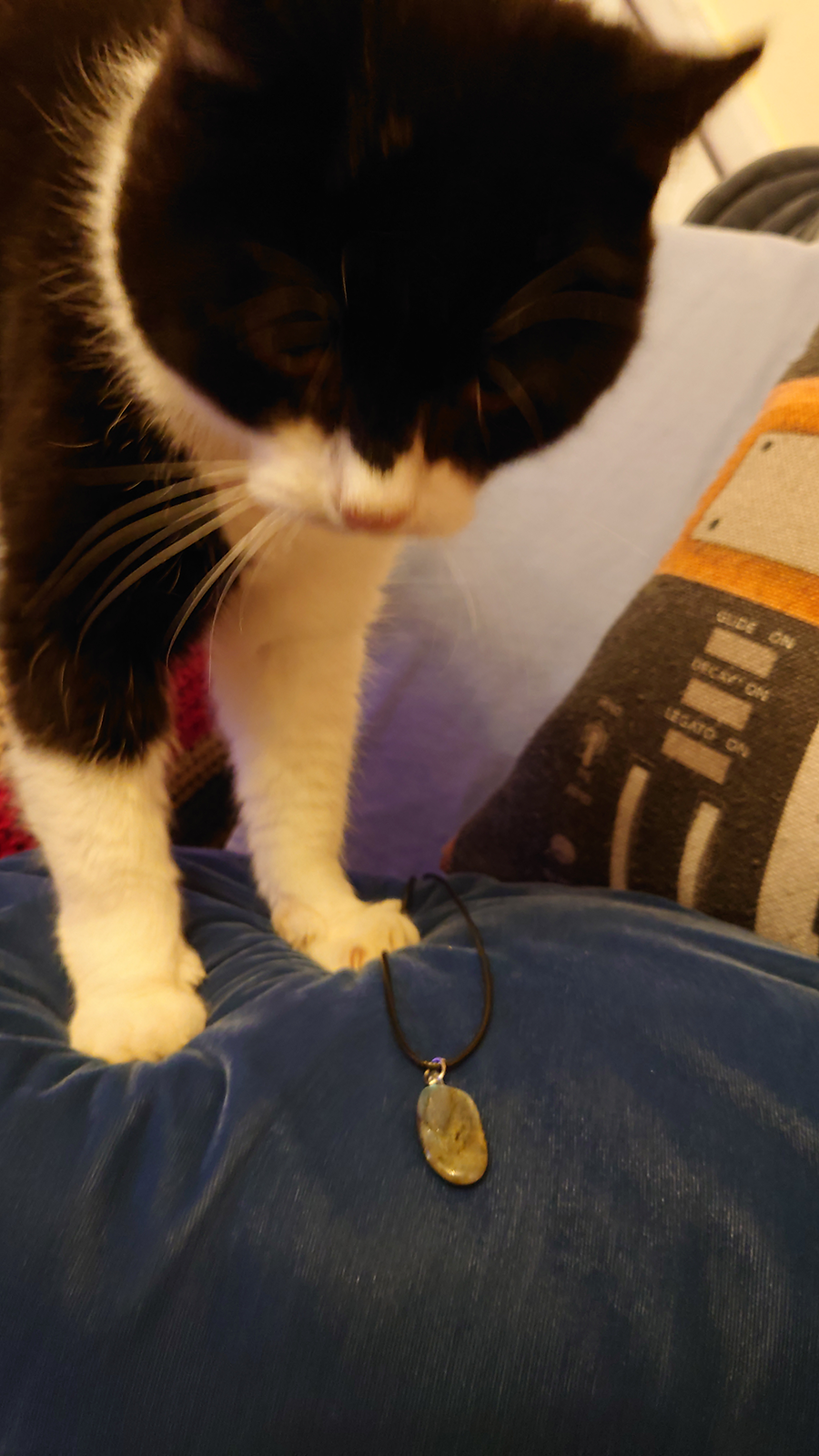 Comes on a black cord with a slip describing its uses and properties.
