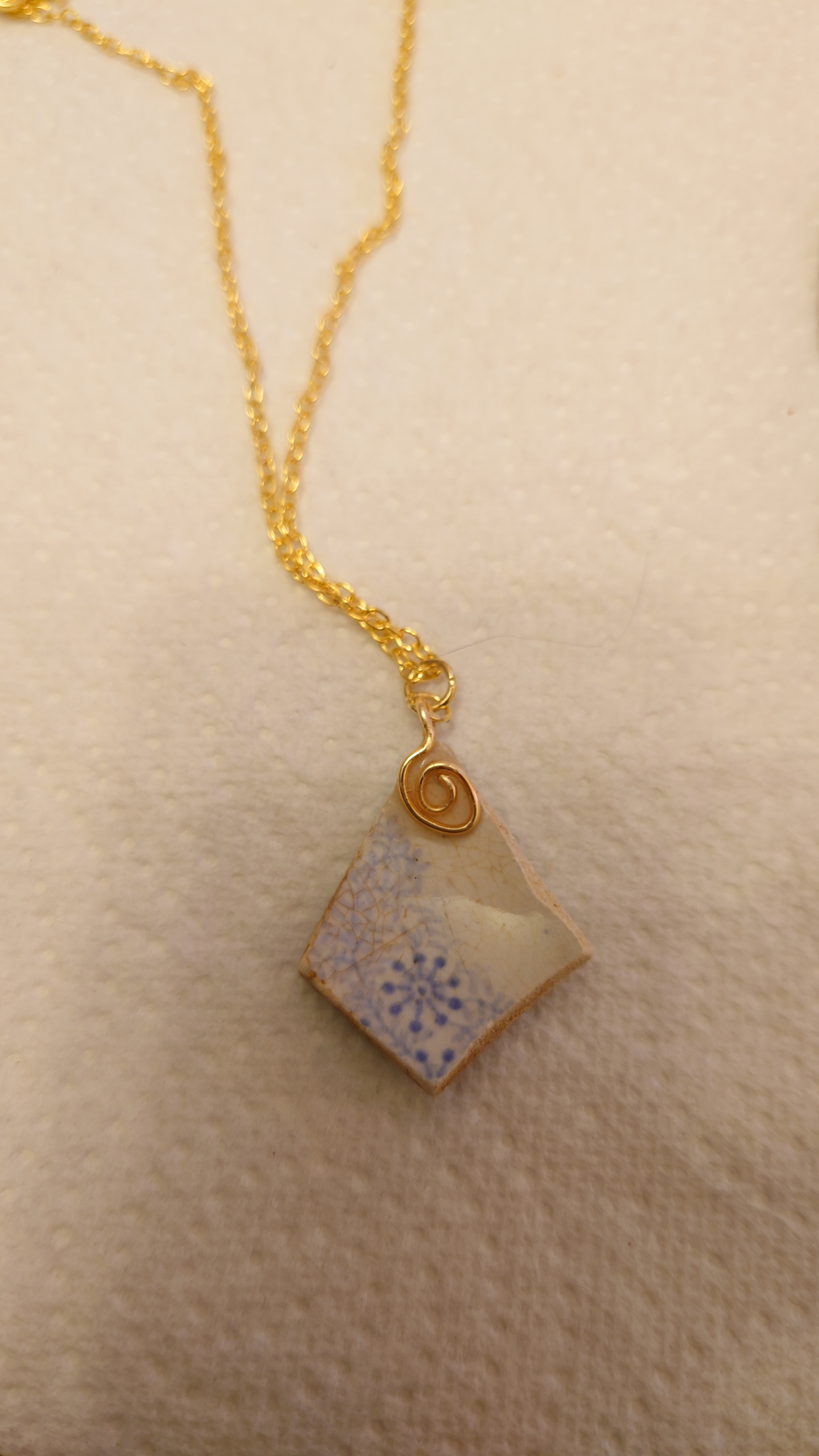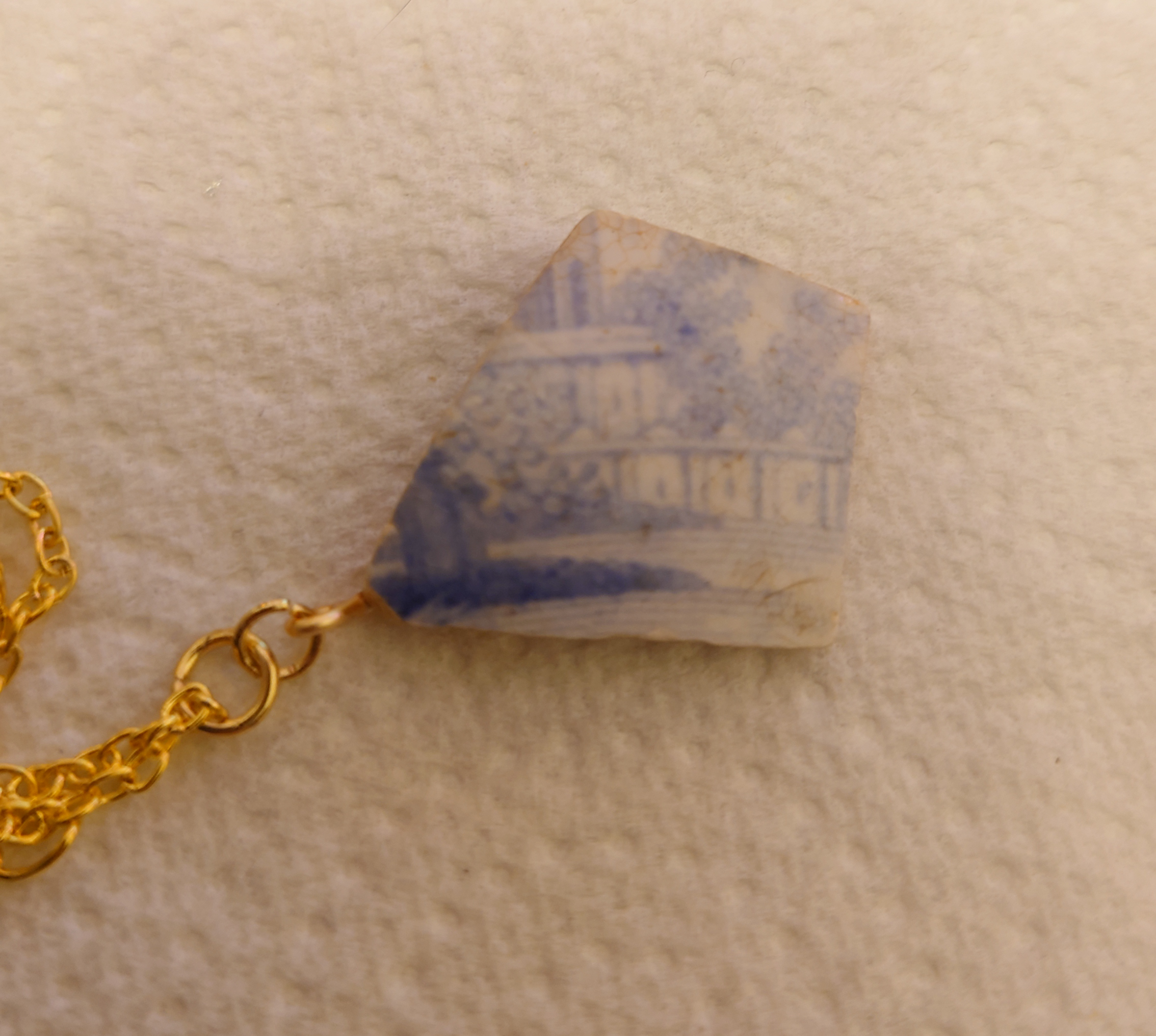A lovely triangular fragment of delicate china, a recognisable section of willow pattern still visible on both sides. With gold plated wire bale, on a 50 cm gold metal chain.