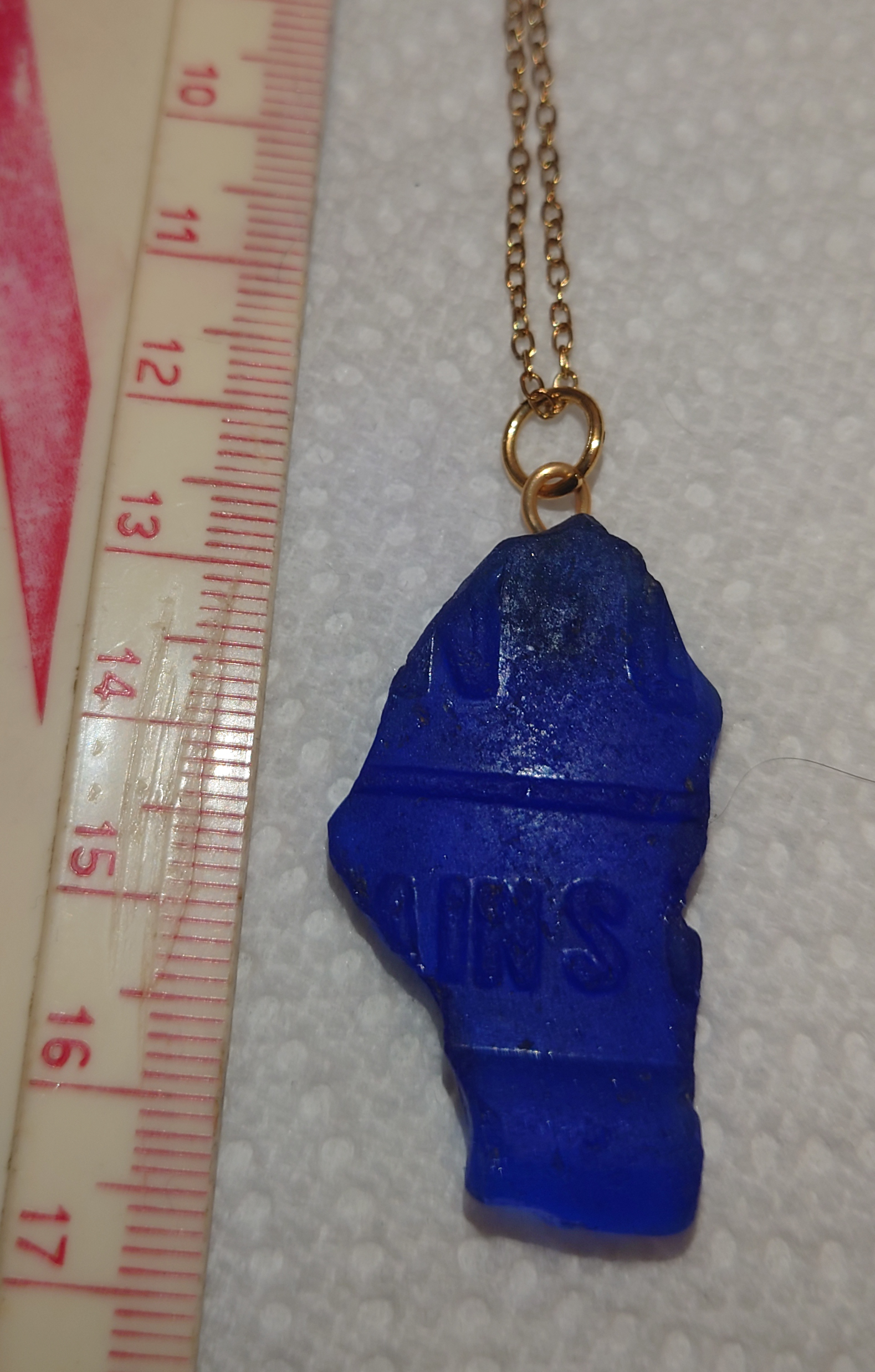This strikingly blue river glass necklace is presented on a 50cm gold metal chain and in a box.