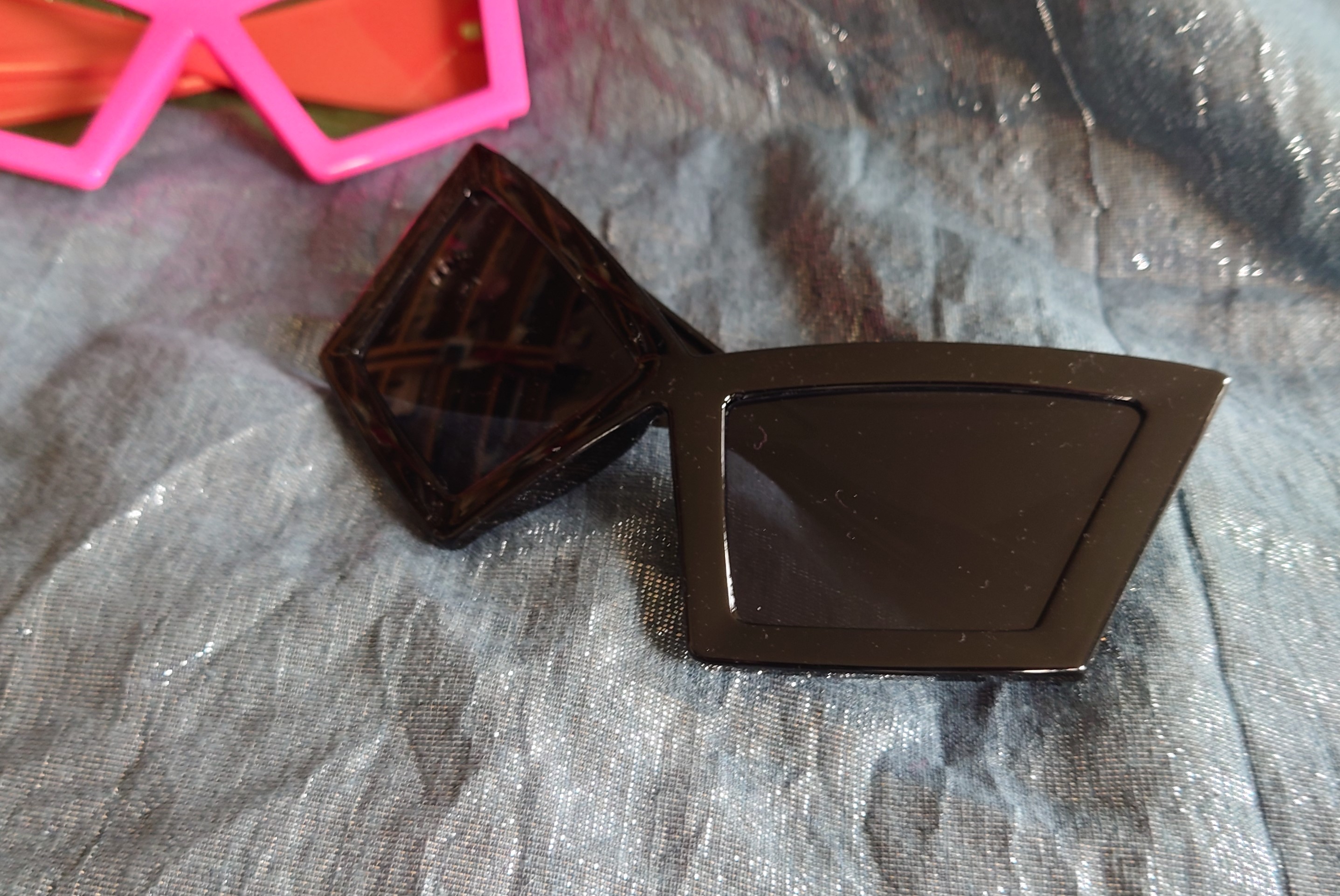 These angular sunglasses in black or pink probably won't do much good in bright sunlight, but boy will you look cool indoors all year round! In black or neon pink.